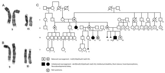 (A) Partial G-banded karyotype of chromosomes 9 and 15, balanced insertion—ins(9;15)(q33;q21.1q22.31). (B) Partial G-banded karyotype of chromosomes 9 and 15, unbalanced insertion—der(9)ins(9;15)(q33;q21.1q22.31)—resulting in duplication of the q21.1q22.31 region of chromosome 15. (C) Five-generation pedigree of the family showing the affected individuals and the transmission of the chromosomal rearrangement in three generations.
