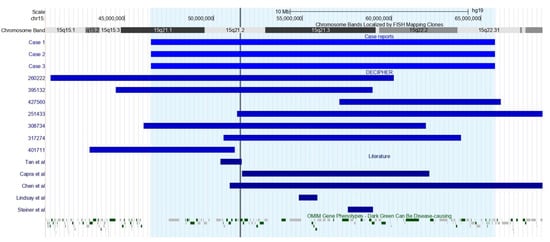 To date, few cases of chromosomal insertions involving chromosome 15 have been described [,,,,]. Chromosome 15 is one of the seven human chromosomes with the highest rates of segmental duplications, which makes it more susceptible to chromosomal rearrangements []. However, we found few cases in the literature presenting duplications that overlap with the 15q21.1-q22.31 region. Only five cases published were found in the literature [,,,,], and seven cases in DECIPHER (260222; 395132; 427560; 251433; 308734; 317274; and 401711) (Figure 4). The most frequent clinical features found among patients harboring duplications between 15q15.1 and q26.3 regions were short stature (9/15); intellectual disability (8/15); delayed speech and language development (8/15); neurodevelopmental delay (7/15); congenital heart disease (8/15); low-set ears (7/15); and facial dysmorphisms (6/15) (Table 1).