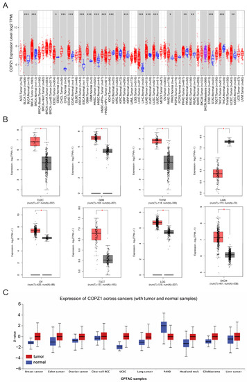 At present, one of the major factors endangering human health is cancer, and the number of people dying from cancer is increasing gradually every year [1]. Proto-oncogene mutations or amplifications, combined with the deactivation of tumor suppressor genes, enable cancer cells to proliferate indefinitely and to resist cell death [2,3]. Targeted inhibitors for HER2, EGFR, and BRAF, and immune checkpoint blockade have achieved certain efficacy in the treatment of tumors, but the occurrence of drug resistance is an important reason to limit their efficacy [4,5,6,7]. Therefore, The search for novel cancer treatment targets and biomarkers is a top priority. COPZ1 is a component of coatomer protein complex I and is involved in the maturation of endosomes, autophagy, and the construction of coated vesicles on the Golgi membrane [8,9,10,11]. COPZ2 is a similar complex that also belongs to the coatomer protein complex family. The most difference between them is their expression pattern: COPZ1 expresses in most cancer cells and normal cells, while COPZ2 expresses in the normal cells and is down-regulated in cancer cells [12]. Previous research has demonstrated that COPZ1 is indispensable for many types of cancer since the cancer cell possessed a low expression of the isoform COPZ2, including breast cancer, ovarian cancer, and prostate cancer [12]. Depletion of COPZ1 can lead to thyroid tumor cell death both in vitro and in vivo [13]. Besides, Silencing COPZ1 causes the endoplasmic reticulum (ER) stress to increase and the type I IFN pathway activated, and then promotes the secretion of a variety of inflammatory molecules and enhances anti-tumor immunity in thyroid cancer [14]. Another research found that knockdown of COPZ1 leads to ferroptosis by inducing NCOA4-mediated autophagy in human GBM cells [15]. These results imply that COPZ1 plays a critical role in maintaining the survival of tu-mor cells and may represent a viable therapeutic target for the treatment of cancer. However, the regulation mechanism and prognostic potential of COPZ1 in different cancers remains unclear. The pan-cancer bioinformatic analysis may therefore enable us to better elucidate its function in human cancer.