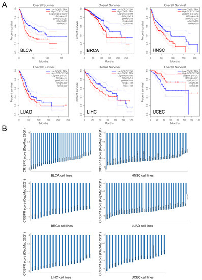 High expression of COPZ1 correlated with poor prognosis. (A) Overall survival analysis of COPZ1 in BCLA, BRCA, HNSC, LIHC, LUAD, and UCEC in the TCGA dataset using GEPIA2. (B) The Achilles crisper score analysis of the sensitivity of cell lines to COPZ1 knockdown. The score below “0” indicated the cell growth inhibition by COPZ1 knockdown.