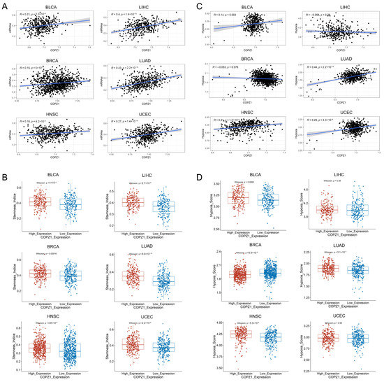Since stemness and hypoxia are two important features of tumors, we next investigated how the tumor’s stemness and hypoxia index were related to COPZ1 expression. With the mRNAsi (mRNA expression-based stemness index) of six types of cancers acquired from a published article [19], in both of the six different types of tumors, we observed that COPZ1 was highly associated with the mRNAsi score (Figure 4A). We then explored the stemness score between the COPZ1 high and low expression groups. The results indicated that in comparison to the low-expression group, the stemness score in the COPZ1 high-expression group was significantly higher (Figure 4B). For hypoxia analysis, as shown in Figure 4C, the expression of COPZ1 positively correlated with the hypoxia score in BLCA (R = 0.14, p = 0.004), HNSC (R = 0.21, p = 1.4 × 10−6), LUAD (R = 0.44, p < 2.2 × 10−16) and UCEC (R = 0.23, p = 4.3 × 10−8). Besides, in BLCA, BRCA, HNSC, and LUAD, the hypoxia score was noticeably greater in the group with high COPZ1 expression. (Figure 4D). These results demonstrated that COPZ1 might aid in the development of the tumor, but more research is required to determine the precise mechanism.