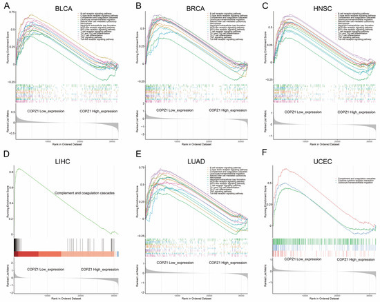 KEGG pathway GSEA analysis of COPZ1 low expression in multiple types of cancer. (A) The GSEA analysis showed the pathways activated in the low COPZ1 expression group in the BLCA. (B) The GSEA analysis showed the pathways activated in the low COPZ1 expression group in the BRCA. (C) The GSEA analysis showed the pathways activated in the low COPZ1 expression group in the HNSC. (D) The GSEA analysis showed the pathways activated in the low COPZ1 expression group in the LIHC. (E) The GSEA analysis showed the pathways activated in the low COPZ1 expression group in the LUAD. (F) The GSEA analysis showed the pathways activated in the low COPZ1 expression group in the UCEC.