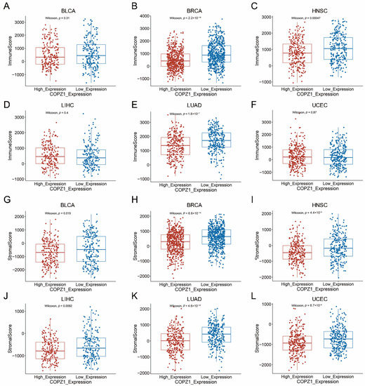 The correlation between COPZ1 expression and immune score and stromal score. (A–F) The immune score between high and low COPZ1 expression groups in multiple cancers. (G–L) The stromal score between high and low COPZ1 expression groups in multiple cancers. The red box means high COPZ1 expression group, and the blue box means low COPZ1 expression group.