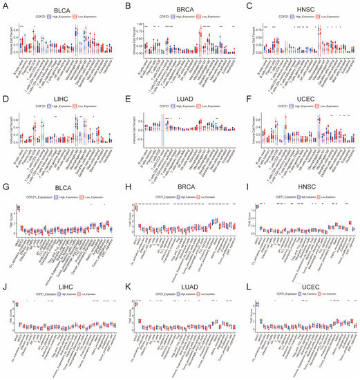 Correlation analysis between COPZ1 expression and tumor-infiltrating immune cells and tumor microenvironment score. (A–F) I Tumor-infiltrating immune cells between high and low COPZ1 expression groups in six types of cancer. (G–L) TME score between high and low COPZ1 expression groups in six types of cancer. The red box means high COPZ1 expression group, and the blue box means low COPZ1 expression group. * p <0.05, ** p <0.01, *** p <0.001.