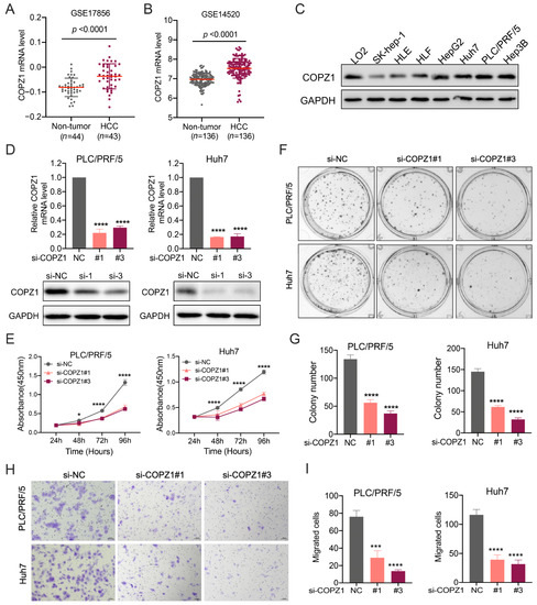High COPZ1 levels contribute to the proliferation and migration of HCC. (A,B) The mRNA level of COPZ1 was higher in HCC tissues than the non-tumor tissues in GSE17856 and GSE14520 datasets. (C) The protein expression profile of COPZ1 in a panel of HCC cell lines and normal human liver cells. (D) Evaluation of the knockdown effect of siRNA targeted for COPZ1 in PLC/PRF/5 and Huh7 cells. (E) COPZ1 silence suppresses the cell viability of PLC/PRF/5 and Huh7 cells. (F,G) The representative images and statistical analysis of colony formation in PLC/PRF/5 and Huh7 cells treated with siRNA targeted for COPZ1 or negative control. (H,I) The representative images and statistical analysis of the migrated cells in the utter chamber in migration assay in PLC/PRF/5 and Huh7 cells treated with siRNA targeted for COPZ1 or negative control. The data are presented as the mean ± SDs. * p < 0.05, *** p < 0.001, **** p < 0.0001 (Student’s t-test).