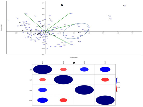 The first two PCs (principal components) were used to generate a genotype-by-trait biplot diagram of the 4 studied physiological growth parameters estimated from the panel containing 124 germplasm lines (Figure 3A). Variations of 56.07% and 25.47% were exhibited by the first and second principal components, respectively. The scattering pattern revealed that the genotypes containing high estimates of growth parameters were placed in the 1st quadrant, which formed a cluster and accommodated 23 genotypes. Germplasm lines containing higher value for the MGR and growth parameters are depicted in a circle in the figure (Figure 3A). The top right (1st quadrant) and bottom left (3rd quadrant) accommodated 65 germplasm lines, forming the biggest group. The majority of the germplasm lines are of a moderate type for the early seedling growth parameters and germination rate with inclusion of a few good types. The 2nd (bottom right) quadrant kept most of the germplasm lines containing high RSG and MGR (Figure 3A).