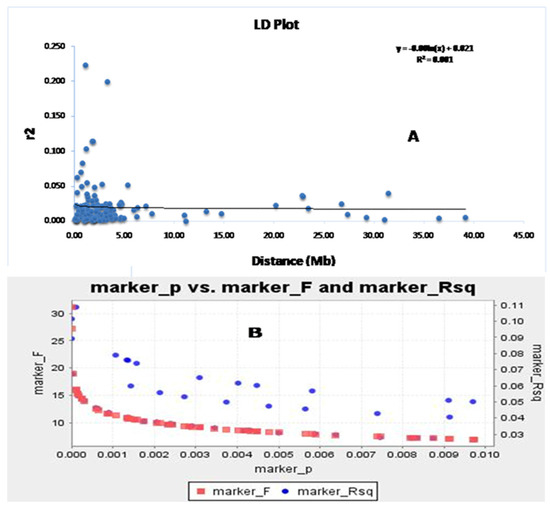 The association of markers with different traits was successfully used to map the traits through a disequilibrium study. The continuance of LD decay is an important factor for obtaining the disequilibrium in the population. The LD decay rate indicates the markers associated with the growth parameters that will be useful in the discovery of allelic variants or new genes regulating these studied traits. The syntenic r2 value was utilized to draw the LD decay plot of the population against the physical distance of the two markers in million base pairs (Figure 5A). The linked markers showed a decrease in r2 for an increase in the linkage distance. It was noted that the LD decay declined sharply for the linked markers at 1–1.5 mega base pairs and then the decay was gradual, with a very slow decay rate noted. Therefore, it is clear from the graph that LD decay is continuing for the four growth parameters in the population. The germplasm lines showing the admixture type may have originated in the evolution due to the existence of LD decay of these four traits. A similar trend is also observed in the marker R2, along with the marker ‘F’ versus marker ‘P’ plot (Figure 5B,C). This study indicated the strength of the marker–trait association with the associated markers for the studied traits.