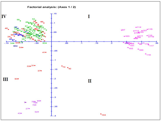 The principal coordinate analysis (PCoA) for the two dimension diagrams is drawn on the basis of the genotyping results obtained by using the 143 SSR markers that grouped the genotypes for genetic relatedness among the germplasm lines (Figure 6). The inertia for component 1 and component 2 were 11.6% and 7.27% of total inertia, respectively. The germplasm lines were placed on the four quadrants at different spots, which formed four major groups (Figure 7). A total of 13, 13, 18 and 80 germplasm lines were allocated into the 1st, 2nd, 3rd and 4th quadrant, respectively. The germplasm lines of each subpopulation are clustered in different quadrants. The 4th quadrant showed a single major group accommodating 80 germplasm lines. The 2nd major group present in the 1st and 2nd quadrants accommodated 23 germplasm lines. Genotypes from subpopulation 1 and subpopulation 2 are placed together in this group. The majority of the germplasm lines of this group are good for seedling growth parameters. The admix genotypes are depicted in brick color (Figure 6). The majority of the members of subpopulation 3 are in quadrant 4 and depicted in green color. Eight subpopulation 4 members along with seven admix types, two subpopulation 3 members and one subpopulation 1 member are allotted in the 3rd quadrant.