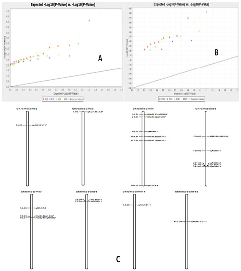 The Q-Q diagram constructed by analysis with the generalized linear model for the four growth parameters (A) p < 0.05, (B) p < 0.01) and(C) the positions of the QTLs on the chromosomes for RSG, RGR, AGR and MGR detected by association mapping in rice.