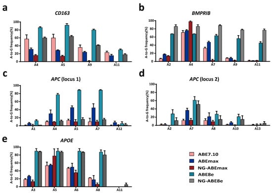 The product purity at the target positions of these ABEs varied considerably (Figure 3). The occurrence rates of the desired A-to-G conversions, with or without bystander conversions, were 14.00–92.00% (CD163 A5), 2.90–88.30% (BMPRⅠB A7), 9.33–77.33% (APC locus 1, A4), 12.00–61.33% (APC locus 2, A7) and 6.30–87.68% (APOE A8); however, the precise (desired) A-to-G conversion rates (without bystanders) at these five positions were 2.00–8.67% (CD163 A5), 0–1.33% (BMPRⅠB A7), 0–2.00% (APC locus 1, A4), 0.67–12.00% (APC locus 2, A7) and 0–5.04% (APOE A8) (Figure 3). In other words, high-frequency bystander A-to-G conversions were observed for these target positions (Figure 3, Figure S2).