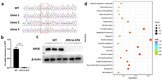 Three single-cell clones with ABE-mediated start-codon mutations (ATG to GTG) in the APOE gene were used for qRT-PCR and Western blotting analyses. Two of them carried bystander products (Figure 5a), and no bystander edit beyond the sgRNA region was found. The qRT-PCR results indicated that the mRNA expression of the APOE gene decreased by 96% compared to that of the WT cells (Figure 5b). The Western blots demonstrated the absence of APOE protein in gene-edited cells (Figure 5c). Moreover, KEGG enrichment analysis revealed that the DEGs between the APOE-edited and WT cells were significantly associated with neurodegenerative disorders such as Alzheimer’s disease, Parkinson’s disease and Huntington’s disease, as well as tumor progression such as melanoma, hepatocellular carcinoma and colorectal cancer (Figure 5d).