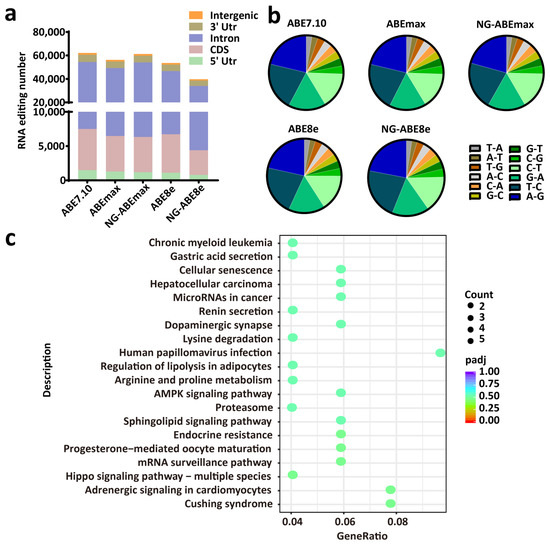 RNA editing activities induced by ABEs in APOE-gene-edited PFFs. (a) The numbers and distributions of RNA editing sites in genomic regions induced by ABEs in the PFFs. n = 3, independent replicates. (b) The pie chart shows the frequencies of different types of RNA editing. (c) The top 20 enriched KEGG pathways of RNA editing sites induced by ABE8e. The x-axis represents the enrichment factor. The y-axis corresponds to the KEGG pathways. The colors of the dots represent the adjusted p-values, and the sizes of the dots represent the number of edited genes mapped to each reference pathway. R package ggplot2 (3.3.1) was performed to draw the bubble chart of the KEGG enrichment analysis.