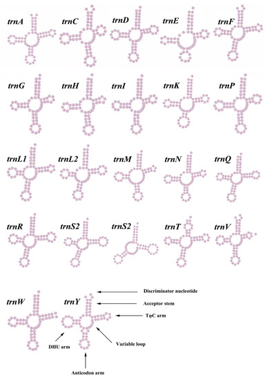 Putative secondary structures of the tRNA genes in the mitogenome of M. virgata. The tRNAs are labeled with the abbreviations of their corresponding amino acids.