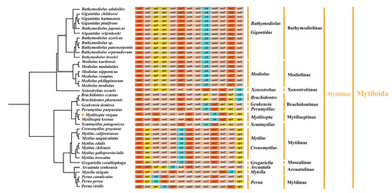 Recent molecular phylogenetic studies have proposed different hypotheses for the higher-level phylogeny of Pteriomorphia. However, most of the families within this order remain unresolved [3,75]. Given this, the taxonomy of the Mytilidae family is primarily reliant on morphological characteristics, and there is little consensus regarding specific taxonomic assignments within the family. Additional studies are, therefore, needed to address phylogenetic relationships within the Mytilidae family.