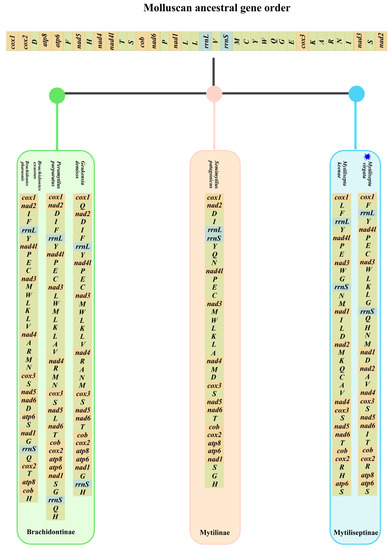 The mitochondrial genome (mitogenome) is regarded as a good model of phylogenetics in the investigation of species due to its small molecular weight and maternal inheritance [1]. With the rapid advancement of next-generation sequencing (NGS) technology, there was a significant reduction in the cost of DNA sequencing, and analyses of the complete mitochondrial genomes (mitogenomes) have gained popularity in recent years for phylogenetic investigations [2,3]. Compared to nuclear genes, mitochondrial DNA sequences can provide more informative data for phylogenetic analysis, as well as multiple structural genomic features [4,5], such as gene length, compositional features, gene order, and the secondary structure of the encoded RNA. The typical metazoan mitogenome is generally a circular, double-stranded molecule ranging from 15 to 20 kb in size, and contains 37 genes: 2 for rRNAs, 13 for proteins, and 22 for tRNAs [6]. The family Mytilidae constitutes a major clade within Mytilida and includes approximately 88 extant genera containing 1632 species (World Register of Marine Species, https://www.marinespecies.org/ (accessed 6 September 2022)). The species among Mytilidae are represented by one of the largest numbers of cultivated and marketed bivalves, such as Mytilus spp., which are widely distributed in cold and temperate waters throughout the world’s oceans [7]. Furthermore, species of Perna spp. are well researched because of their significant economic and social importance in the aquaculture and fishing sectors [8]. The dominant rocky shore bivalve Xenostrobus securis Lamarck, 1819, and the freshwater bivalve Limnoperna fortunei Dunker, 1857, became invasive in the Northern Hemisphere [9]. Non-obvious small taxa such as Modiolarca subpicta, Cantraine, 1835 [10], and the taxa Mytilisepta virgata Wiegmann, 1837, have attracted less scientific attention. Many bivalve species exhibit a distinctive pattern of mitochondrial inheritance known as doubly uniparental inheritance (DUI) [11]. At present, no studies have reported whether there is DUI in the mitochondria of M. virgata.