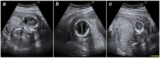 Prenatal ultrasound findings at 16–17 weeks of gestation: dolichocephaly (a), ventriculomegaly (b), thick placenta (c).