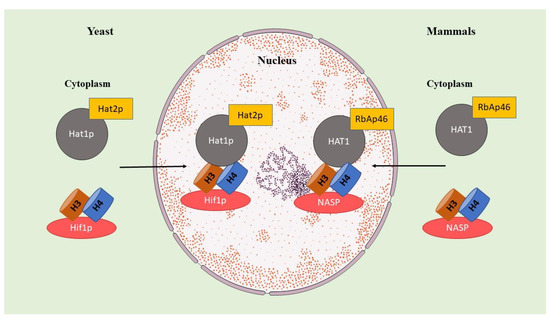 HAT1 forms two complexes. In the cytoplasm of mammalian cells, HAT1, or its homolog in yeast, Hat1p, forms a complex with RbAp46 (or its homolog Hat2p in yeast). The nuclear complex with HAT1, named NuB4, also includes a histone chaperone, nuclear autoantigenic sperm protein (NASP) in mammals or Hif1p in yeast (see Figure 1) [15].