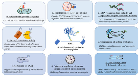 HAT1 fulfills both canonical and noncanonical functions. The former is represented by the enzymatic acetylation of K5 and K12 in the N-terminus of H4 in a newly assembled H3H4 dimer in the cytoplasm [23]. Nevertheless, the fact that most HAT1 molecules are found in the nucleus led to the supposition that this enzyme is involved in functions in addition to the acetylation of the newly synthesized histone H4 called noncanonical functions and are summarized below (see Figure 2).