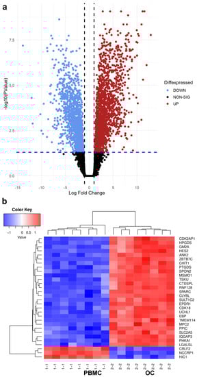 (a) Volcano plot illustrating the DEGs between the OC and PBMC groups. Genes significantly up- and downregulated in the OC group relative to the PBMC group are indicated using red and blue dots, respectively. (b) Heat map based on the hierarchical clustering for the top 30 differentially expressed genes identified between the PBMC and OC groups.