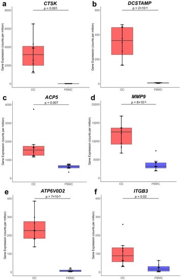Box plots displaying the relative expression of established OC genes: (a) CTSK, (b) DCSTAMP, (c) ACP5, (d) MMP9, (e) ATP6V0D2, (f) ITGB3. The box plots are filled in red (left) and blue (right) representing the OC and PBMC groups, respectively. The y-axis indicates the expression of the genes in counts per million, whereas the x-axis denotes the OC and PBMC groups. A solid horizontal line in the middle of each box plot represents the median gene expression value. p-values in these plots were calculated using a t-test, with p < 0.05 considered statistically significant.