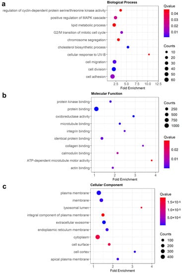 Bubble plots for GO analysis of upregulated DEGs. The top 10 enrichment terms from the GO analyses are plotted for (a) biological process, (b) molecular function, and (c) cellular component.