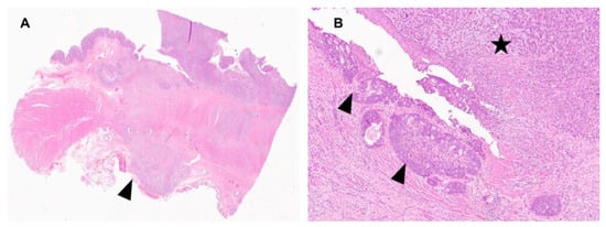 Hematoxylin and Eosin staining of the surgical specimen. (A) Low power view (2× magnification) showing the serosa invasion (arrowhead). (B) The glandular (intestinal-type) and the poorly-cohesive components are marked by arrowheads and an asterisk, respectively (10× magnification).