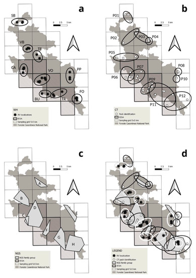 Dissegna, A.; Rota, M.; Basile, S.; Fusco, G.; Mencucci, M.; Cappai, N.; Galaverni, M.; Fabbri, E.; Velli, E.; Caniglia, R. How to Choose? Comparing Different Methods to Count Wolf Packs in a Protected Area of the Northern Apennines. Genes 2023, 14, 932. https://doi.org/10.3390/genes14040932