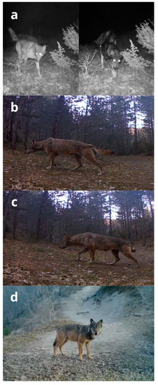 - Canu, A.; Mattioli, L.; Santini, A.; Apollonio, M.; Scandura, M. ‘Video-scats’: Combining camera trapping and non-invasive genotyping to assess individual identity and hybrid status in gray wolf. Wildl. Biol. 2017, 2017, 1–9. [Google Scholar] [CrossRef]