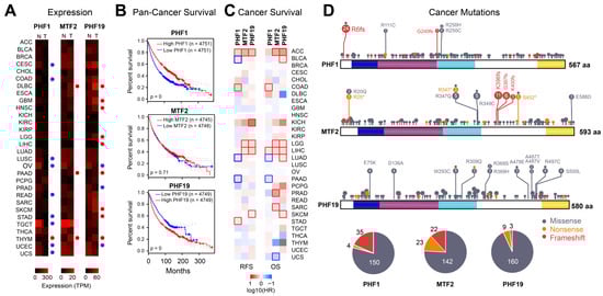 (A) Comparison of gene expression of the PCL proteins in normal (N) and tumor (T) tissue. Red and blue circles indicate significantly increased or decreased gene expression in tumor versus normal samples, respectively. (B) Kaplan–Meier plot of pancancer patient survival (overall survival) dependent on the expression of PHF1, MTF2, and PHF19. The data were split based on median expression. (C) Survival plots showing the hazard ratio (HR) for the three PCLs for individual cancer types. RFS = relapse free survival and OS = overall survival. Cancers with rectangles indicate a significant difference in survival between low and high expression. Data from TCGA [48] and visualized by GePIA [49]. (D) Mutations of the three PCL proteins, based on the COSMIC database [47]. Visualized using ProteinPaint [50]. * = mutation to a stop codon, fs = frameshift mutation. The pie charts show the relative distribution of missense, nonsense, and frameshift mutations for each PCL protein.