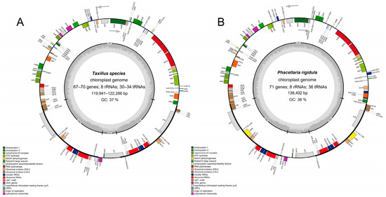 (A) Chloroplast genome map of Taxillus species, using T. chinensis as the template. (B) Chloroplast genome map of P. rigidula. The grey arrows indicate the direction of transcription of genes. Genes in the inner circle are transcribed in a clockwise direction, while those in the outer circle are transcribed counter-clockwise. The varying shades of gray in the inner circle indicate the distribution of GC and AT content, with darker shades corresponding to GC content and lighter shades corresponding to AT content.