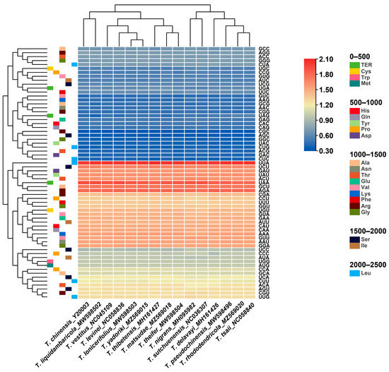 Heat map of RSCU values among Taxillus and Phacellaria species.