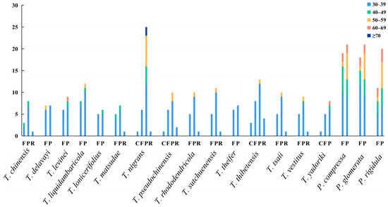 Long repeats have significant implications in genome rearrangement and are frequently employed to examine phylogenetic relationships among species. Additionally, long repeats can stimulate intermolecular recombination in chloroplast genomes, thereby enhancing diversity [64]. These long repeats are mainly distributed in the intergene region and intron sequence, including forward (F), palindrome (P), reverse (R), and complement (C). All repeats analyzed in this study were 30 bp or longer and had a sequence similarity of at least 90%. In Taxillus species, 11 (T. lonicerifolius)–33 (T. nigrans) long repeats were identified, most of which were F and P repeats. The length of C and R repeats was mainly within the range of 30–39 bp. Repeats with a length of 60–69 and ≥70 bp only existed in T. levinei, T. nigrans, and T. yadoriki. In Phacellaria species, 31 (P. rigidula)–40 (P. compressa) long repeats were identified, all of which were F and P repeats (Figure 4).