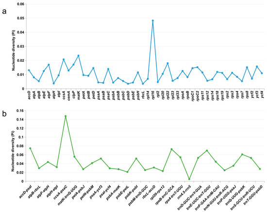 Nucleotide diversity of shared various regions with Pi > 0 and length > 200 bp in 15 chloroplast genomes of Taxillus species. (a) Pi values in the genes regions. (b) Pi values in the intergenic spacers regions.
