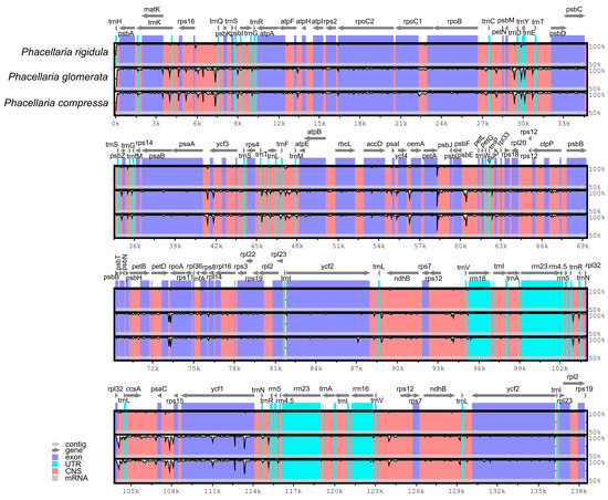 In addition, with the P. rigidula genome as the reference genome, the complete chloroplast genomes of three Phacellaria species were compared (Figure 6). The LSC and SSC regions exhibited significantly higher variations compared to the IR regions, while the rRNA genes remained highly conserved with minimal variations. The genes had a very high degree of conservation (most had >90% similarity), and the most varied gene was ycf1. Variations in intergenic regions were significantly greater than those in protein-coding regions; these intergenic regions included rps16-trnQ-UUG, psbE-petL, rpl32-trnL-UAG, and psaC-rps15.