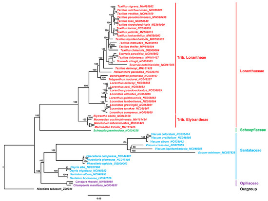 The relatively conservative chloroplast genome contains a large amount of nucleotide and amino acid sequence information and is of great value in plant evolution, taxonomy, and phylogenetic studies [72]. A phylogenetic tree was constructed using the chloroplast genomes of 50 Santalales species, with N. tabacum (Z00044) as the outgroup, to explore the phylogenetic relationship and phylogenetic position of the species in Taxillus and Phacellaria.
