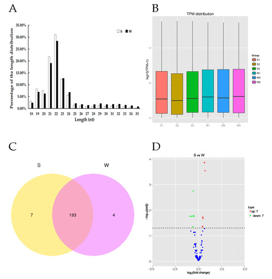 Distribution of length, transcript per million (TPM) distribution, Venn diagram and Volcano plot of miRNAs. (A) Distribution of the lengths of the miRNAs reads in the honey bee with strong or weak olfactory performance. The lengths of the miRNAs mainly ranged from 18 nt to 35 nt and peaked at 22 nt. (B) The y-axis represents log10TPM+1from three groups S, strong and W, weak performing learning and memory. (C) Venn diagram represent the total of 204 miRNAs identified in the two groups (S and W) of honey bees, of which seven unique in S and four unique in W and 193 common DEmiRNAs. (D) Differentially expressed miRNAs in the brain between strong olfactory performance and weak olfactory performance based on the fold change (FC) and the significance levels after correction.