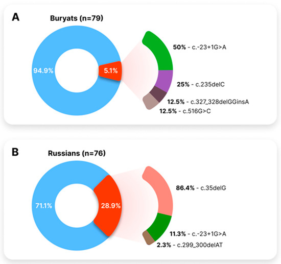 Contribution of the GJB2 variants to the etiology of HI in studied patients. (A)—Contribution of the GJB2 variants to the etiology of HI in Buryat patients. (B)—Contribution of the GJB2 variants to the etiology of HI in Russian patients. Proportions of GJB2-negative and GJB2-positive patients are shown in blue and red, accordingly. The allele frequency of the GJB2 variants was calculated in unrelated patients.