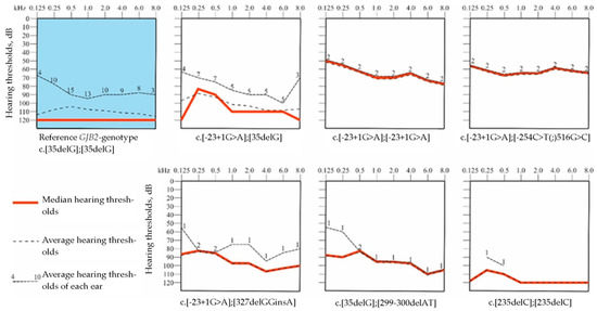 Audiological profiles in patients with the GJB2 gene variants. The reference group (shown in blue)—patients with genotype c.[35delG];[35delG] (16 individuals, 32 ears).