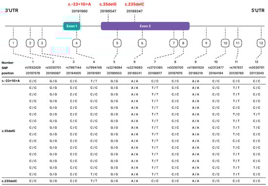The genotypes of 12 SNPs, flanking the GJB2 gene in 16 patients homozygous for c.-23+1G>A (n = 1), c.35delG (n = 14), and c.235delC (n = 1). Positions of c.-23+1G>A, c.35delG, c.235delC and 12 SNPs were defined according to GRCh38.p13 Genome Assembly (https://www.ncbi.nlm.nih.gov/assembl, accessed on 25 January 2023).