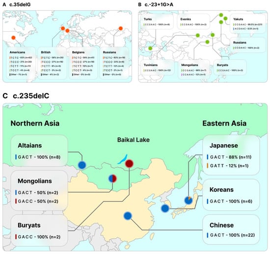 - Zytsar, M.V.; Barashkov, N.A.; Bady-Khoo, M.S.; Shubina-Olejnik, O.A.; Danilenko, N.G.; Bondar, A.A.; Morozov, I.V.; Solovyev, A.V.; Danilchenko, V.Y.; Maximov, V.N.; et al. Updated Carrier Rates for c.35delG (GJB2) Associated with Hearing Loss in Russia and Common c.35delG Haplotypes in Siberia. BMC Med. Genet. 2018, 19, 138. [Google Scholar] [CrossRef] [PubMed]