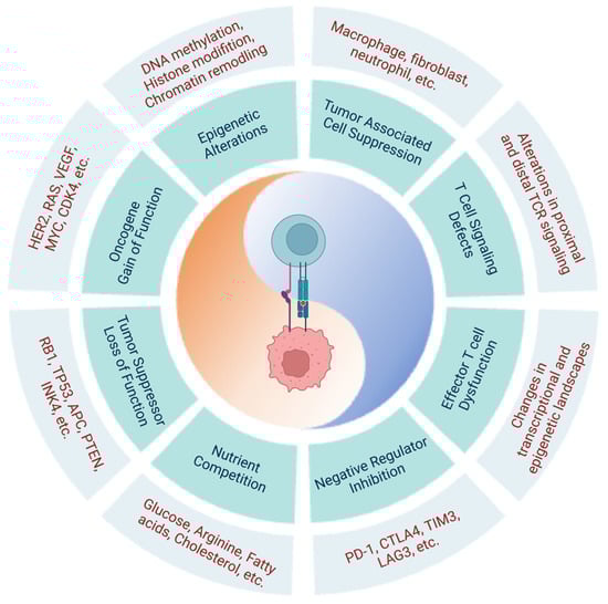 In addition to endogenous T cell dysfunction caused by negative regulator upregulation and changes in the transcriptional and epigenetic landscapes, cancer-cell-intrinsic characteristics also contribute to immune dysfunction and cancer progression (Figure 1).