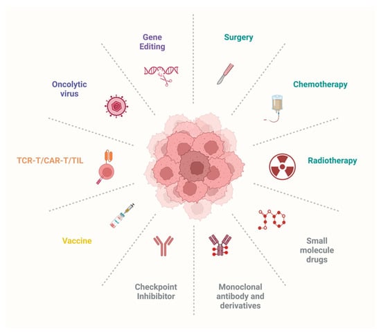 The landscape of cancer therapeutics. This figure illustrates the various therapeutics that are currently in use for the treatment of cancer. These include traditional therapies such as surgery, chemotherapy, and radiotherapy, targeted therapies including small molecule drugs, monoclonal antibodies and derivatives, oncolytic viruses, and gene editing, as well as immunotherapies including cancer vaccines, checkpoint inhibitors, and engineered T cell therapies.