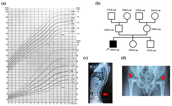 The clinical information of the proband. (a) the growth chart of the proband, the red dots indicated height and weight at different time points; (b) the height in his pedigree; (c) the lumbar lordosis in X-ray with red arrow; (d) the epiphyseal dysplasia of bilateral femur in X-ray with red arrow.