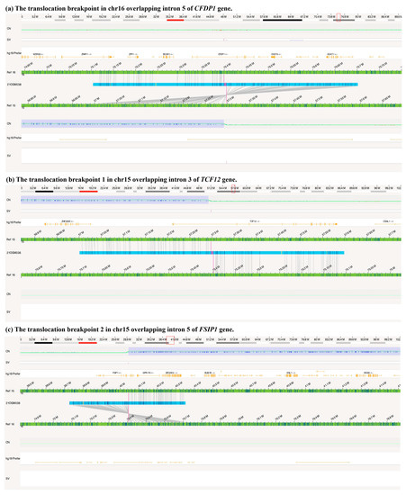 In an attempt to confirm and characterize the SV found by WES, CNV-seq, and karyotyping in the proband, we carried out OGM. As shown in Figure 3, there was an inter-translocation (inversion) between chromosomes 15 and 16, and a duplicative copy number of chromosome 15, 40.04–57.29 Mb, was also found. In addition, OGM revealed that there were two breakpoints in chromosome 15 overlapping with the TCF12 gene and FSIP1 gene and one breakpoint in chromosome 16 overlapping with the CFDP1 gene (Figure 4). The 75.399 Mb (Chr 16: 75399363 bp) of chromosome 16 was connected to the 57.297 Mb (Chr 15: 57297589 bp) of Chromosome15 to form a TCF12-CFDP1 fusion gene (breakpoint one), which was determined to retain the CFDP1 promoter (Figure 4a,b). In addition, the 40.044 Mb of Chromosome 15 (Chr 15: 40044538 bp) was connected to the 75.405 Mb (Chr 16: 75405351 bp) of Chromosome 16 to form an FSIP1-CFDP1 fusion gene (breakpoint two, Figure 4c). These two breakpoint sites caused by the rearrangement were confirmed by LR-PCR, NGS, and Sanger sequencing (Supplementary Material, Figure S3). There were other variants in the circos plot; 1% in the control database, meanwhile overlapping with OMIM genes (Bionano Access 1.7 software built-in), was used to filter the variants. The remaining included five insertions, four deletions, and four duplications; the detailed information on the variants and involved genes are listed in Supplementary Material Table S2. Of note, no variant on that list was related to the clinical phenotypes of our proband. Thus, structure variation, 46, XY, der (16) ins (16;15) (q23; q21.3q14) dn, was carried by our patient and may be responsible for his clinical syndrome.