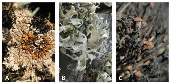 Next-generation sequencing studies have discovered lichen-specific bacterial communities and various secondary fungal lineages inhabiting lichens [,,,]. Several investigators have found basidiomycetous yeasts as symptomless endolichenic fungi on and in lichen thalli []. A specific group of basidiomycetous yeasts, Cyphobasidiales (Pucciniomycotina, Basidiomycota), was detected as a component of the lichen microbiome []. In addition to a phenotypic relationship, the authors associated the abundance of these basidiomycetous yeasts with the production of lichen secondary substances in Bryoria fremontii and B. tortuosa. These two aspects were fundamental to their hypothesis of basidiomycetous yeast being the third mutualistic partner within the lichen complex. However, a subsequent broad metagenomic study of 339 lichen species collected from the Appalachian Mountains in North America failed to detect basidiomycete yeasts in over 97% of the sampled species, leading the authors to question their ubiquity in lichens []. Next to secondary fungi, concomitant photobionts may alter the physiological properties of lichens. For example, Casano et al. [] reported two Trebouxia algae with different physiological performances, which are always present in the lichen thalli of Ramalina farinacea.