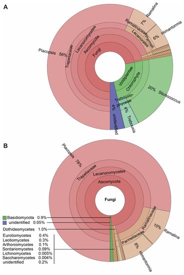 The recent application of metabarcoding approaches using high-throughput sequencing (HTS) has highlighted that the microbiome diversity of lichens may be greater than we think (e.g., [,,]) and can help detect cryptic lineages of lichen-associated communities in recently deglaciated soils. Thus, in a recent study, Zhang et al. [] revealed a high diversity of fungal communities in eleven ice-free Antarctic habitats and elucidated the ecological traits of fungal communities in this unique ice-free area of maritime Antarctica. In addition, Coleine et al. [] demonstrated the importance of sun exposure on the presence of functional groups of fungi in cryptoendolithic Antarctic communities.