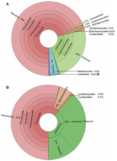 The spectrum of taxa associated with the Antarctic lichens: (A) Ramalina terebrata, and (B) Himantormia lugubris.