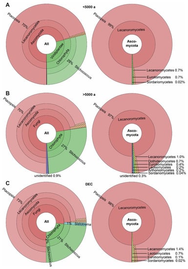 The spectrum of taxa associated with the Antarctic lichen Placopsis growing on soils with different deglaciation times. (A) Deglaciated less than 5000 years ago, (B) deglaciated more than 5000 years ago, and (C) volcanic soil of Deception Island. The Krona plots on the left depict the distribution of all taxa, and on the right indicate Ascomycota only.