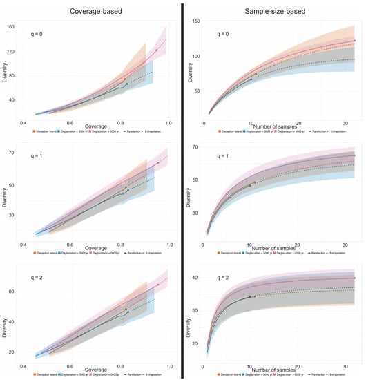 To estimate the expected diversity in the three communities, coverage and sample-size-based rarefaction/extrapolation curves were computed using iNEXT []. Curves with 95% confidence intervals were calculated for Hill numbers q = 0 (species richness), q = 1 (the exponential of Shannon’s entropy index), and q = 2 (the inverse of Simpson’s concentration index). The size in the rarefaction/extrapolation curve was extrapolated to triple the minimum observed sample size, guided by an estimated asymptote (endpoint = 32), as recommended by Chao et al. [,].