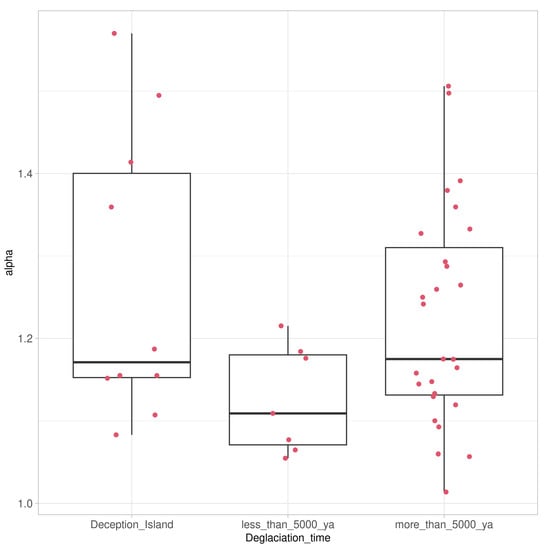 Box-and-whisker plot comparing alpha diversity of lichen-associated communities as expressed by the Shannon Index for taxa associated with the Antarctic lichen genus Placopsis growing on soils with different deglaciation times. Samples collected from the volcanic soil of Deception Island (left), soils deglaciated less than 5000 years ago (middle), and soils deglaciated more than 5000 years ago (right). Box-plot indicates median and lower and upper quartiles, with whiskers drawn within the 1.5 IQR; red dots indicate individual values.